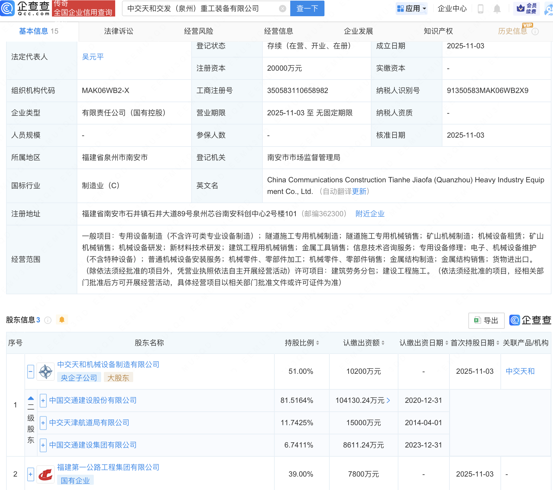 近日,中交天和交发(泉州)重工装备有限公司成立,注册资本2亿元,经营范围包含:隧道施工专用机械制造;隧道施工专用机械销售;矿山机械制造;机械设备租赁等。企查查股权穿透显示优配货主,该公司由中国交建(601800)旗下中交天和机械设备制造有限公司等共同持股。