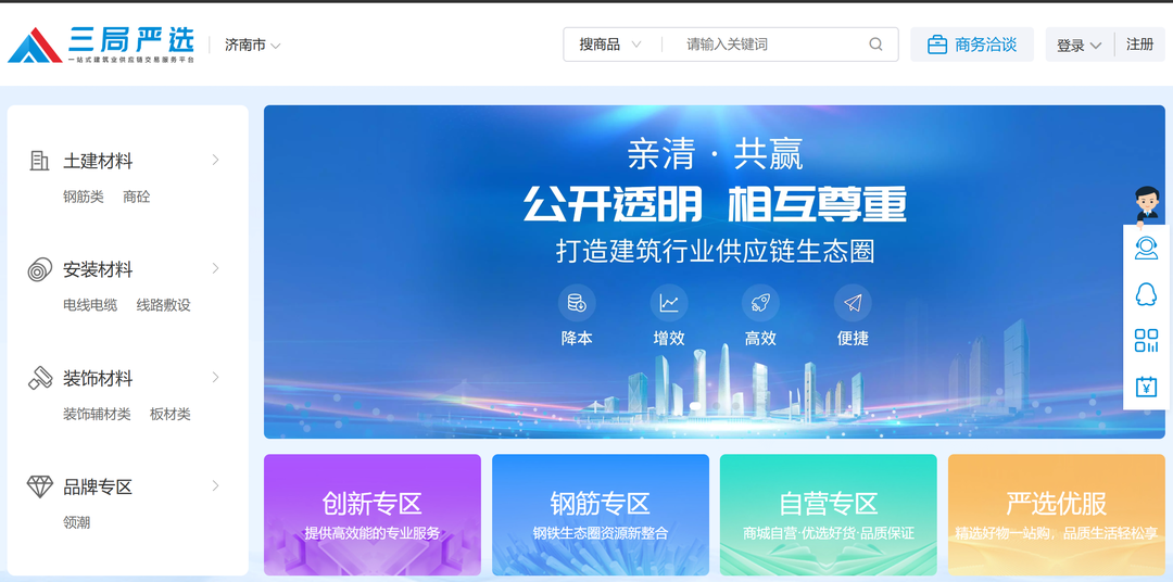 在现场展示的“三局严选商城”,可以看到,土建、安装、装饰等各类建筑物资的数字化供需信息一目了然。平台首页还设置了创新专区、钢筋专区、自营专区、严选优服板块,以精细化分类为采购方提供精准服务。据介绍,三局严选商城是中建三局自主打造的电商交易平台,平台整合了行业上下游头部企业和优质资源。目前严选商城共涵盖物资品类440余个,实现了行业主要品类全覆盖,累计交易规模超1300亿。